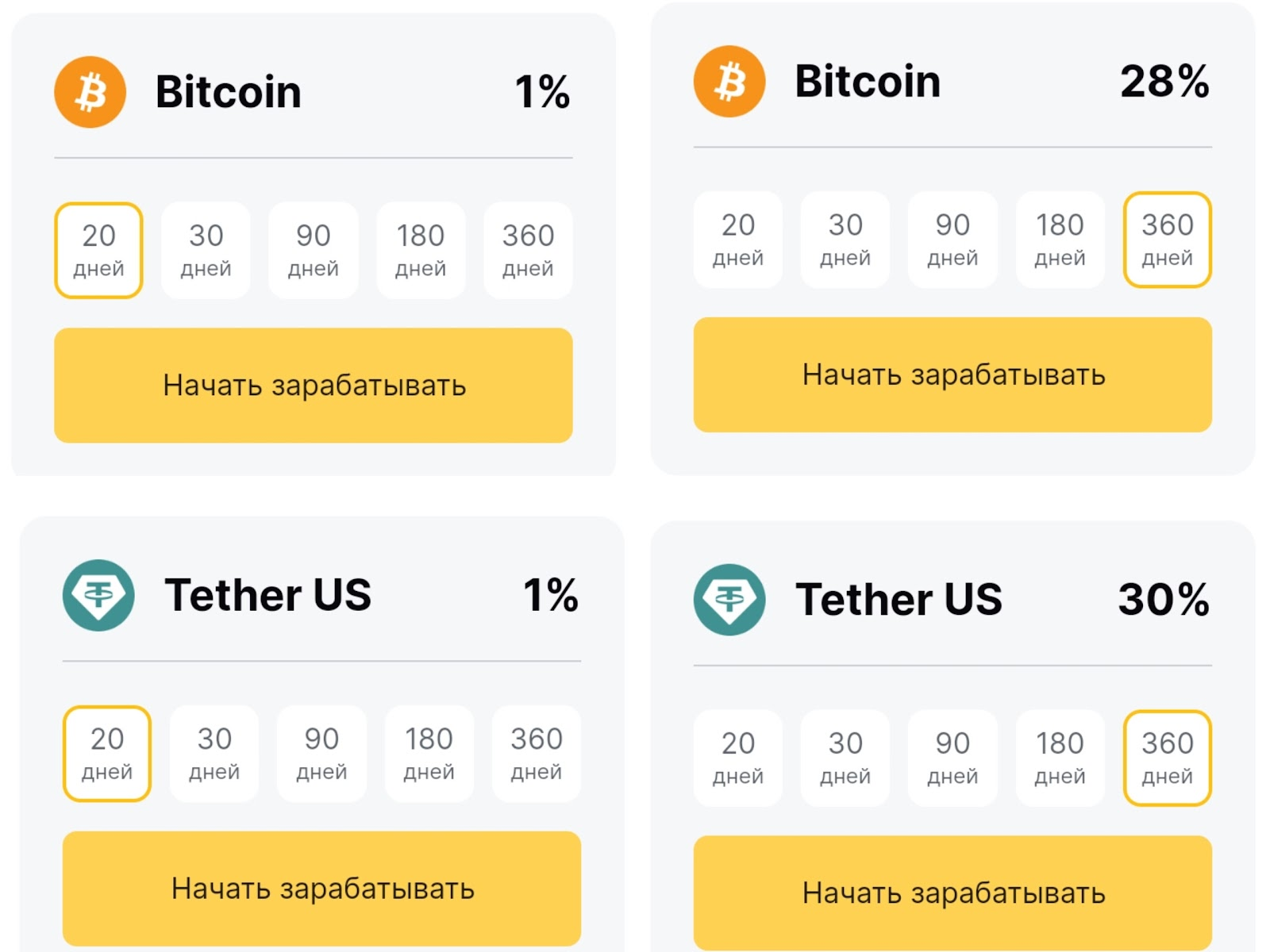 Также на farbity com можно было зарабатывать на инвестировании в биткоины и тезер. Минимально можно было сделать вложение на 20 дней. В этом случае доход составлял 1%. Инвестирование на год давало прибыль на уровне 28-30%. Подробных условий для вкладчиков не было.