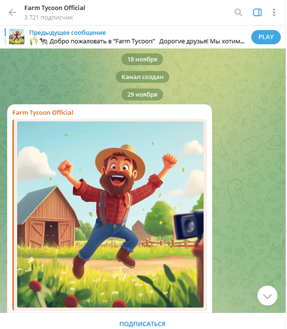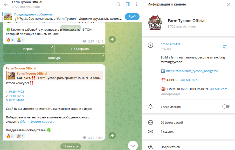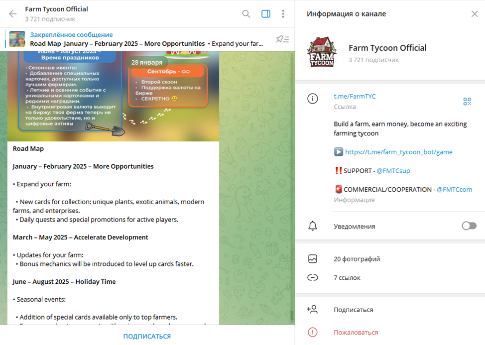 Проект живет и развивается исключительно в пределах Telegram. Информационный телеграм-канал расположен по адресу Farmtyc. По состоянию на 11 февраля 2025 года лента имела 3750 подписчиков. Это честная аудитория без явной накрутки. На канале закрыты комментарии, что не позволяет получить фидбек от реальных пользователей, которые играют с первых дней запуска проекта.Служба поддержки готова решить любой внутриигровой вопрос – достаточно написать сообщение владельцу профиля FMTCsup.