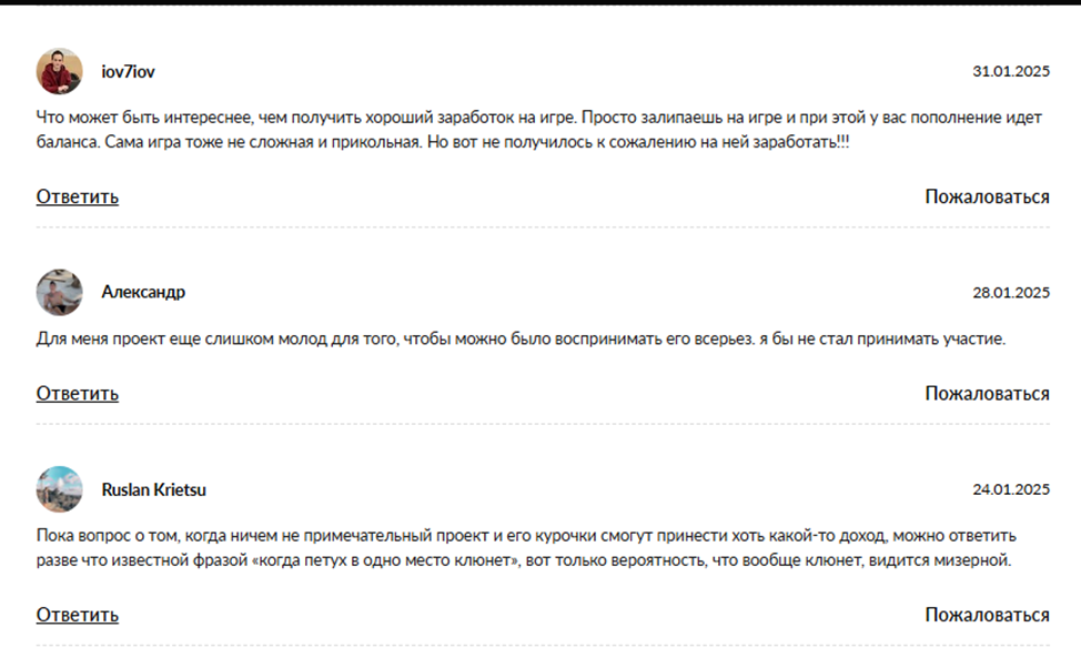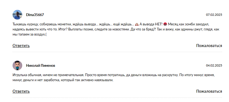После 2,5 месяцев с момента запуска игры в сети практически нет отзывов про Farm Tycoon. Единичные игроки скептически относятся к возможности монетизации игрового времени. Но в целом находят тапалку «интересной и прикольной».