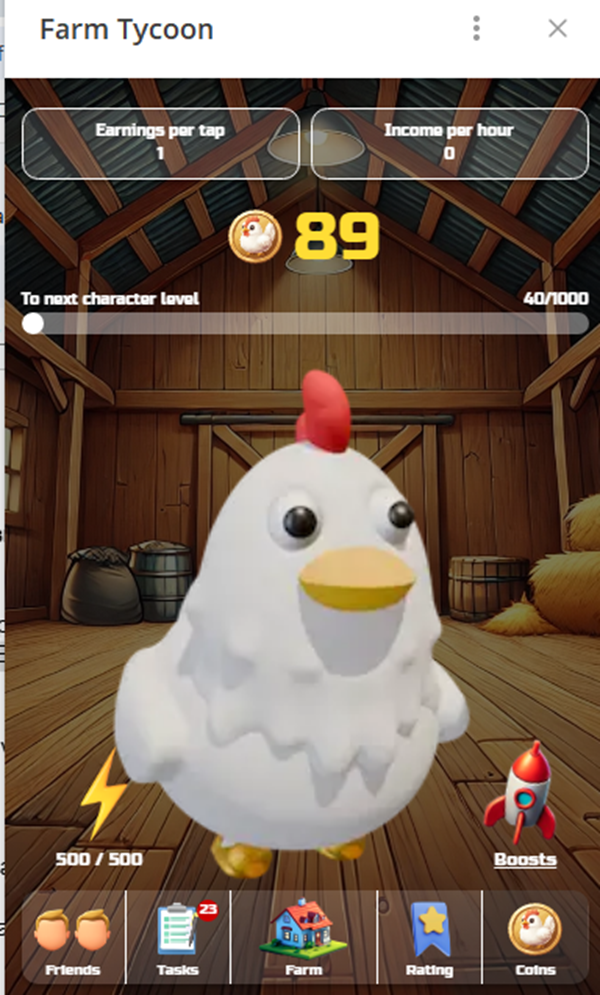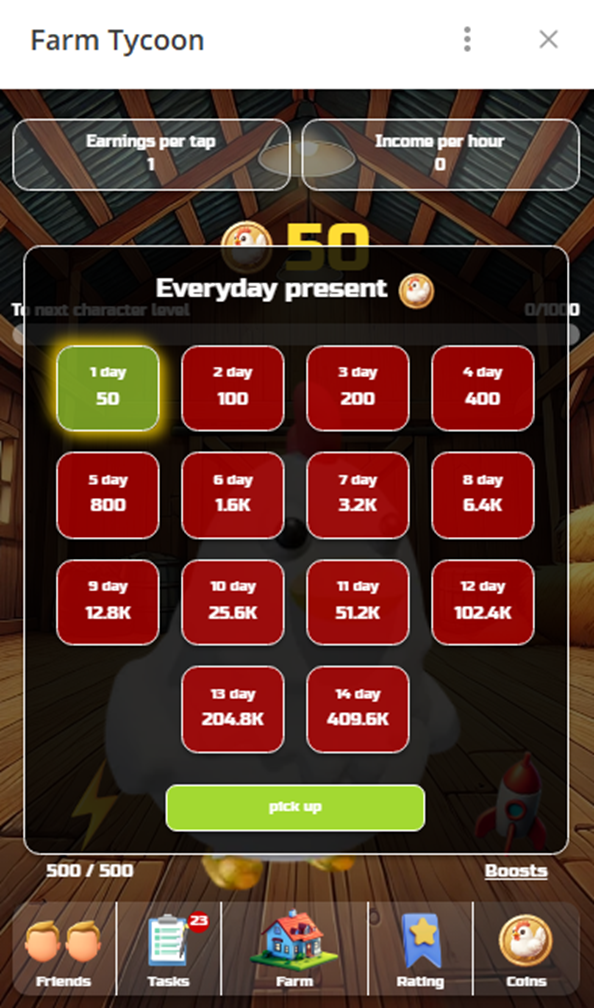 Как и в других кликерах, игроку нужно регулярно заходить в приложение и тапать по курице. От активности зависит не только игровой баланс, но и возможность выбора персонажа на главном экране, доступ к бонусам.