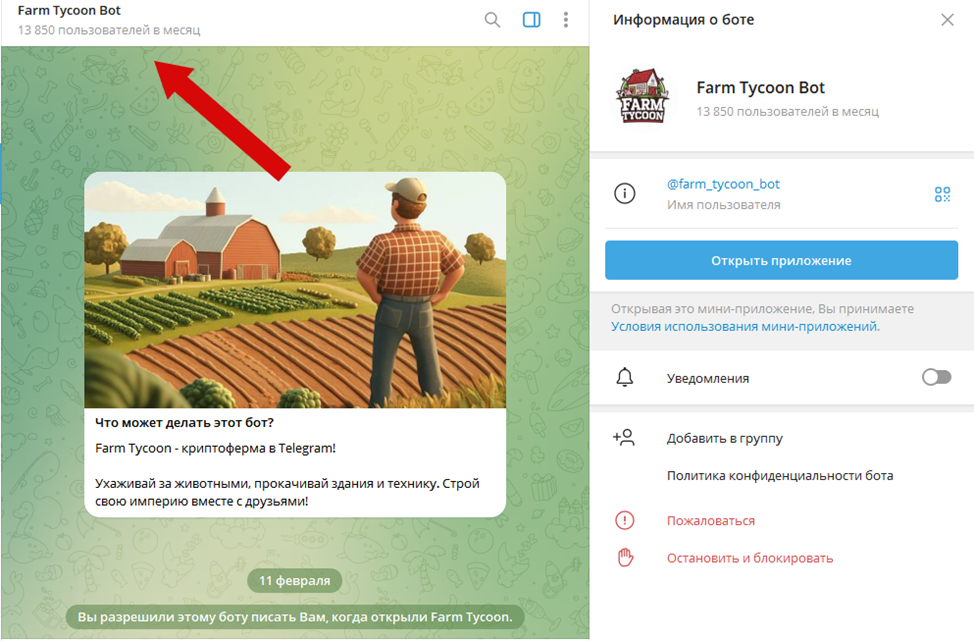 Мини-приложение инициализируется через бот Farm Tycoon Bot. При ежедневном запуске пользователь будет получать бонусы, которые начисляются по прогрессивному принципу.