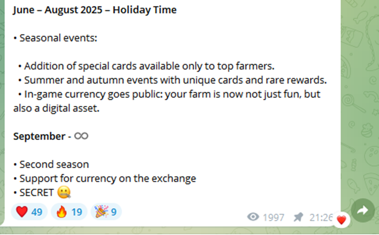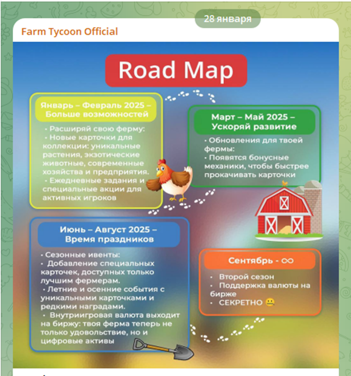 28 января 2025 года создатели игры Farm Tycoon представили «Дорожную карту», позволяющую игрокам оценить перспективы заработка и вывода денег из системы. В ней нет четких дат, указаны мероприятия, запланированные на каждый квартал.