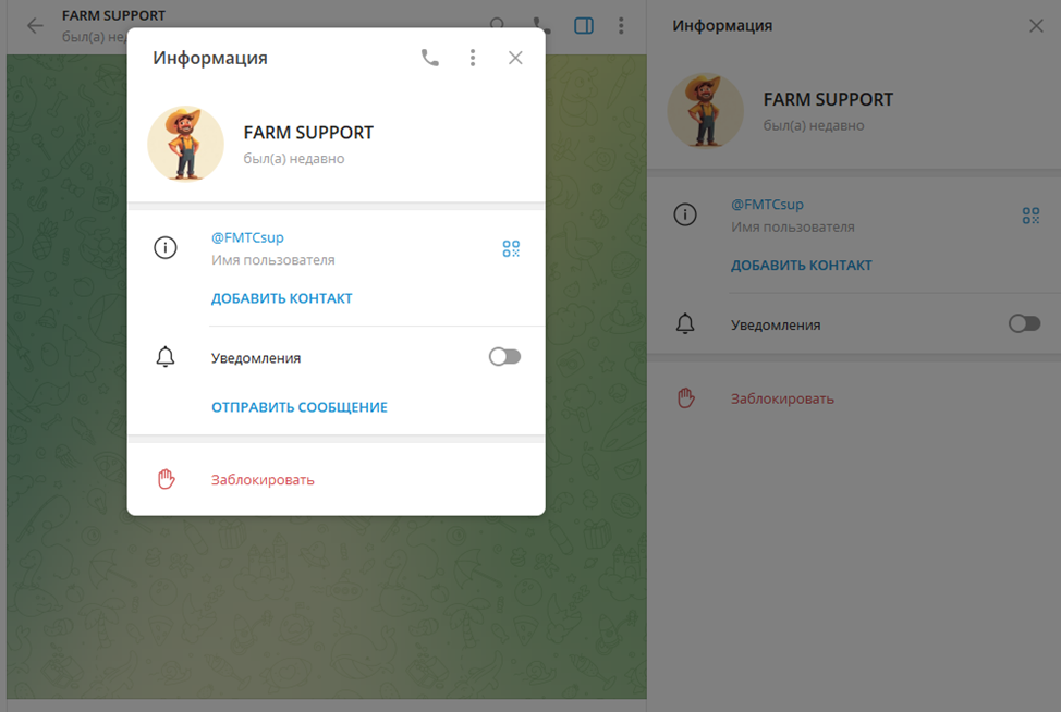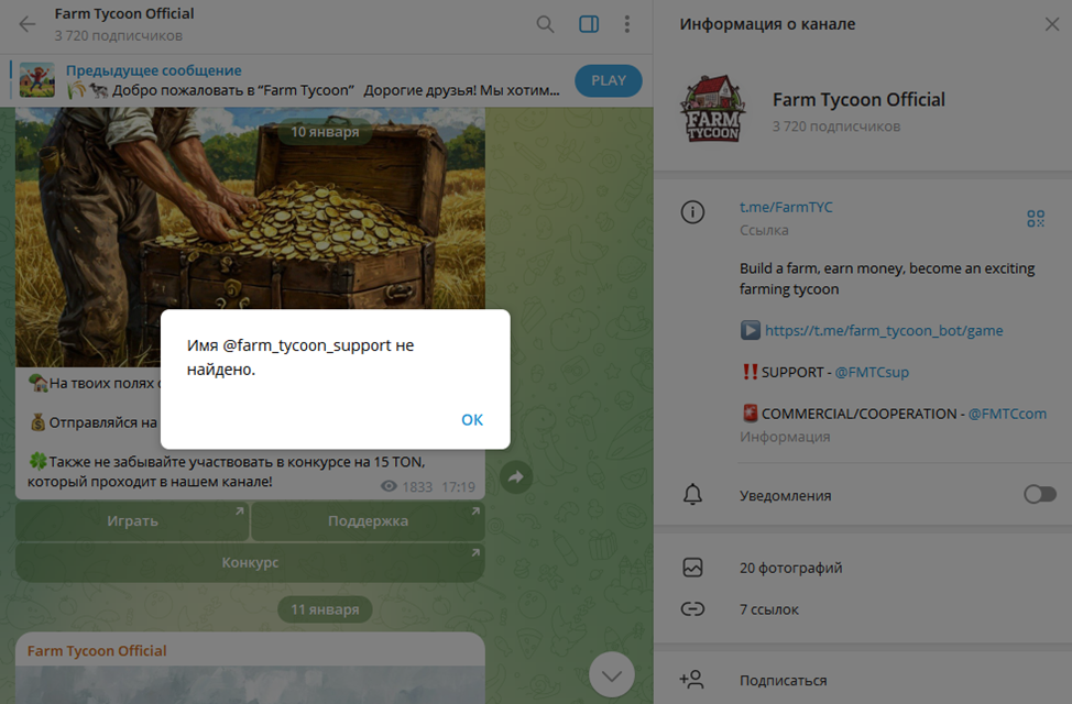 Изначально FARM SUPPORT был расположен на аккаунте Farm Tycoon Support. На момент обзора этот профиль удален по неизвестным причинам.
