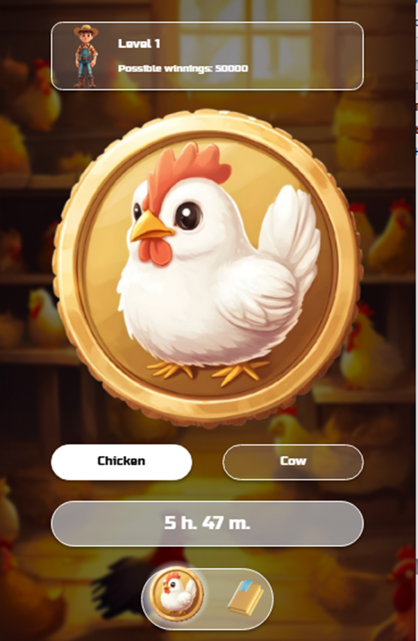 Мини-игра Coin построена по принципу «Орел или решка». Каждые 6 часов трейдер может подкинуть монетку, выбрав между «Коровой» или «Цыпленком». При выигрыше система начисляет бонус до 50000 монет.
