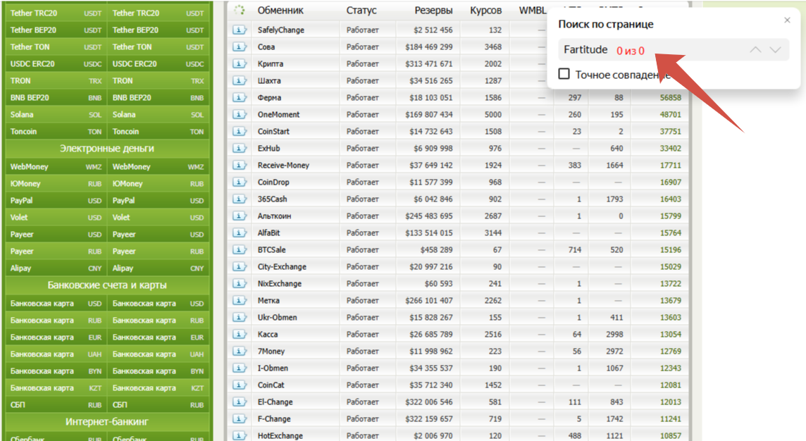 - Отсутствие Fartitude в реестрах мониторинга обменников;