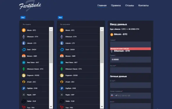 Сайт Fartitude позиционируется как надежный обменник, дающий возможность пользователям конвертировать популярные криптомонеты, а также выводить их на карты российских банков. Наряду с BTC трейдерам доступны все топовые альткоины и малоизвестные токены, не представленные на CEX и DEX и не прошедшие листинг. Перечень активов занимает основную часть главной страницы сервиса. Но приводятся только их наименования без текущих котировок и резервов.Сайт обменника Fartitude Com имеет примитивный дизайн. Состоит из 4 разделов, в которых не представлено никакой полезной информации. Основная часть площадки ― списки монет и встроенный калькулятор. Интересно, что сайт использует незащищенное подключение. Как при таких условиях он обеспечивает безопасность транзакций, остается загадкой.