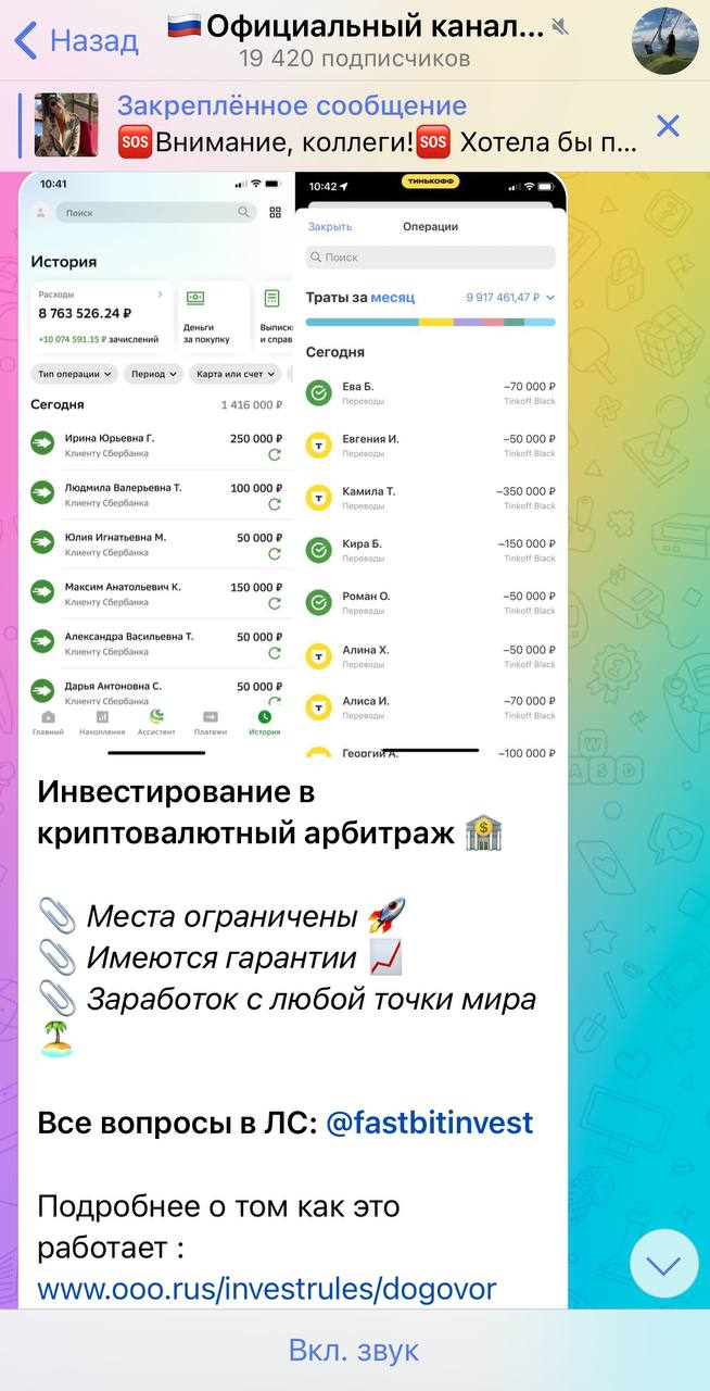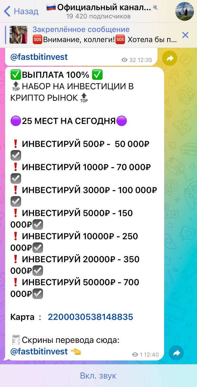 Телеграмм канал трейдера Fastbitinvest носит незамысловатое название Официальный Канал. Ссылки на него регулярно меняют, само название тоже. Аудитория накручена до 20 тысяч, а посты набирают менее 10 просмотров. Комментарии скрыты. Анастасия Власова утверждает, что занимается трейдингом с 2018 года и делает это ювелирно, поэтому готова разогнать любой депозит клиента в сто раз за пару часов. Для чего ей нужно возиться с копейками при такой стратегии доходности, девушка не объясняет, но предупреждает, что бесплатно работать не станет и заберет себе 30% от полученной прибыли.