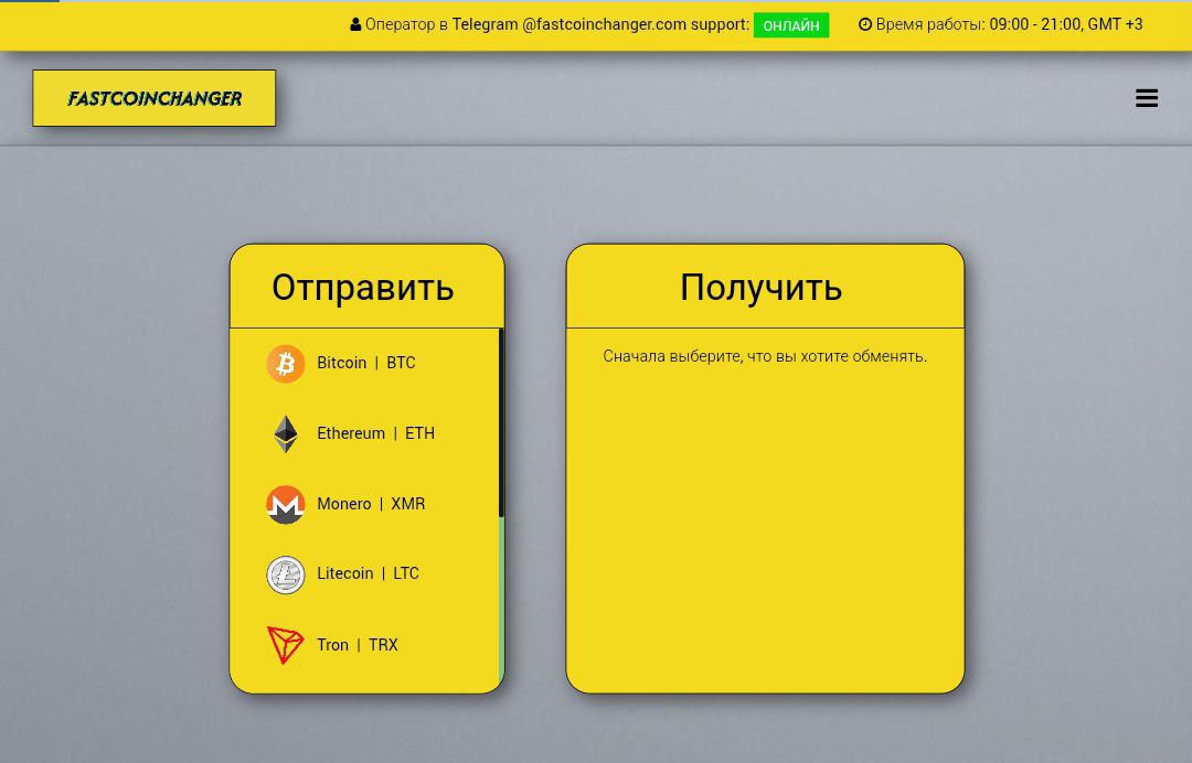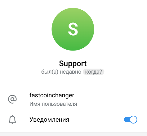 На сайте есть контакт Телеграмма FastCoinChanger, который является службой поддержки, работает с 9.00 до 21.00 по МСК. Так ли это, не предоставляется возможным узнать. У профиля логотипа и названия нет, что также вызывает сомнения насчет реально существующей службы техподдержки.