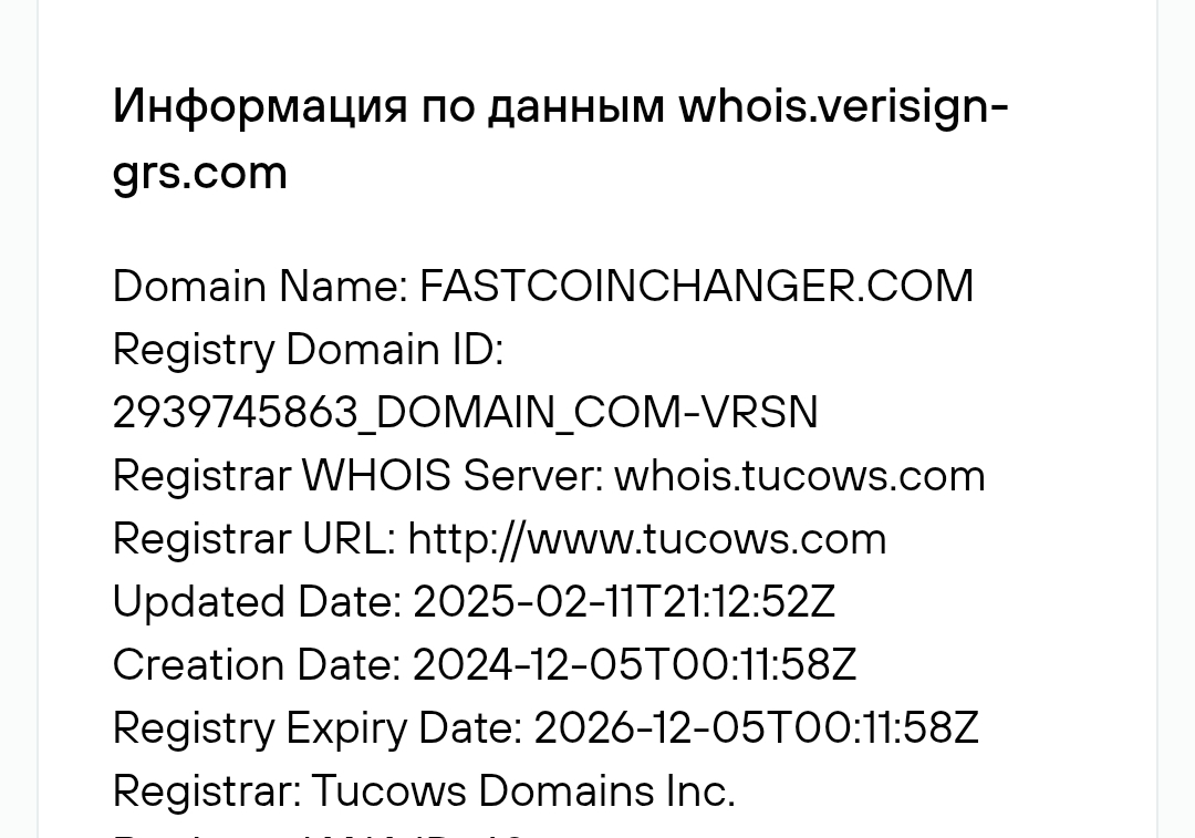 Сайт зарегистрирован в декабре 2024, но заработал только в феврале 2025 года. На апрель этого же года проекту всего два месяца. В рейтингах бирж обменник не был найден, также на самом сайте нет никаких данных, как долго Fast Coin Changer осуществляет свою деятельность. При этом в Footer указаны данные 2019-2025 года, что вряд ли является правдой, судя по дате регистрации домена.