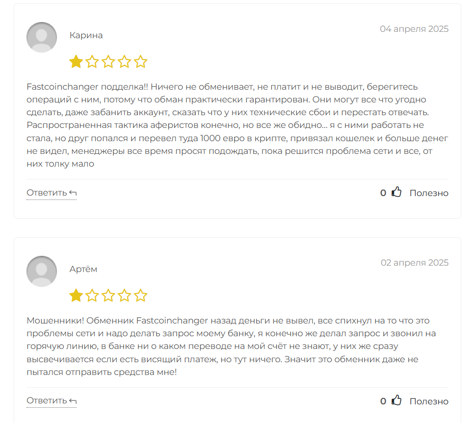 В сети было найдено несколько отзывов о данном обменнике, все они оказались резко негативными. Пользователей обманули на деньги, при обращении в поддержку менеджеры просят подождать и уверяют, что это проблема сети. Следовательно, с большой вероятностью FastCoinChanger — это скам, и скорее всего проект имеет цель заработать на своих клиентах.