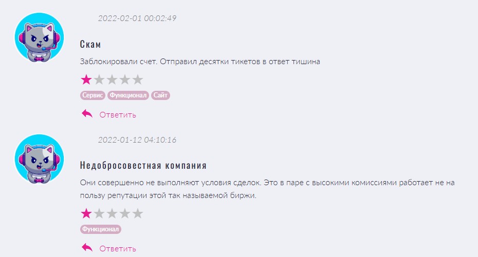Главная боль всех клиентов FatBTC – блокировка счета и отказ в выводе средств. То есть человек пополняет баланс, начинает торговать, возможно, даже выходит в плюс, а потом его аккаунт замораживают. На все вопросы и требования техподдержка отвечает гробовым молчанием. Можно отправить хоть десять разных тикетов – обратной связи не дождетесь.