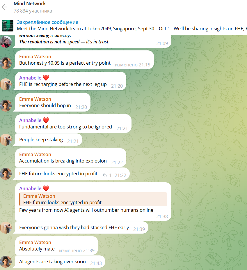 В ТГ-чате проект обсуждают активно. Участники сообщества заявляют, что FHE — это “будущее приватности” и что AI и DeFi вместе — следующий триллионный рынок.
