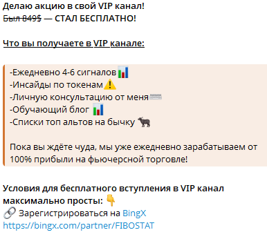 Очередной материал сообщества рекламирует закрытый канал, где наставник ежедневно публикует торговые сигналы. Доступ туда предоставляется бесплатно, однако клиент должен зарегистрироваться на криптобирже Bingx по реферальной ссылке.