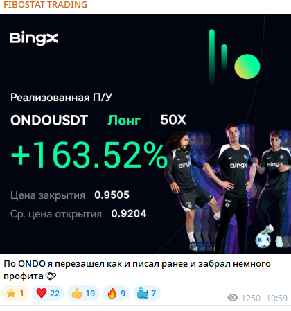 Еще одна запись демонстрирует прибыль в 163%, которую блогер якобы получил от сделки с ONDO. Скорее всего, таким образом трейдер пытается повысить доверие своих подписчиков к своим советам, однако скриншот может оказаться фейковым. Верифицировать его нельзя.