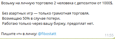 Кроме того, блогер призывает всех желающих прийти к нему «на личную торговлю». Для этого нужно иметь депозит от $1 тыс и написать трейдеру в личные сообщения в Телеграм по адресу @ Fibostatt.