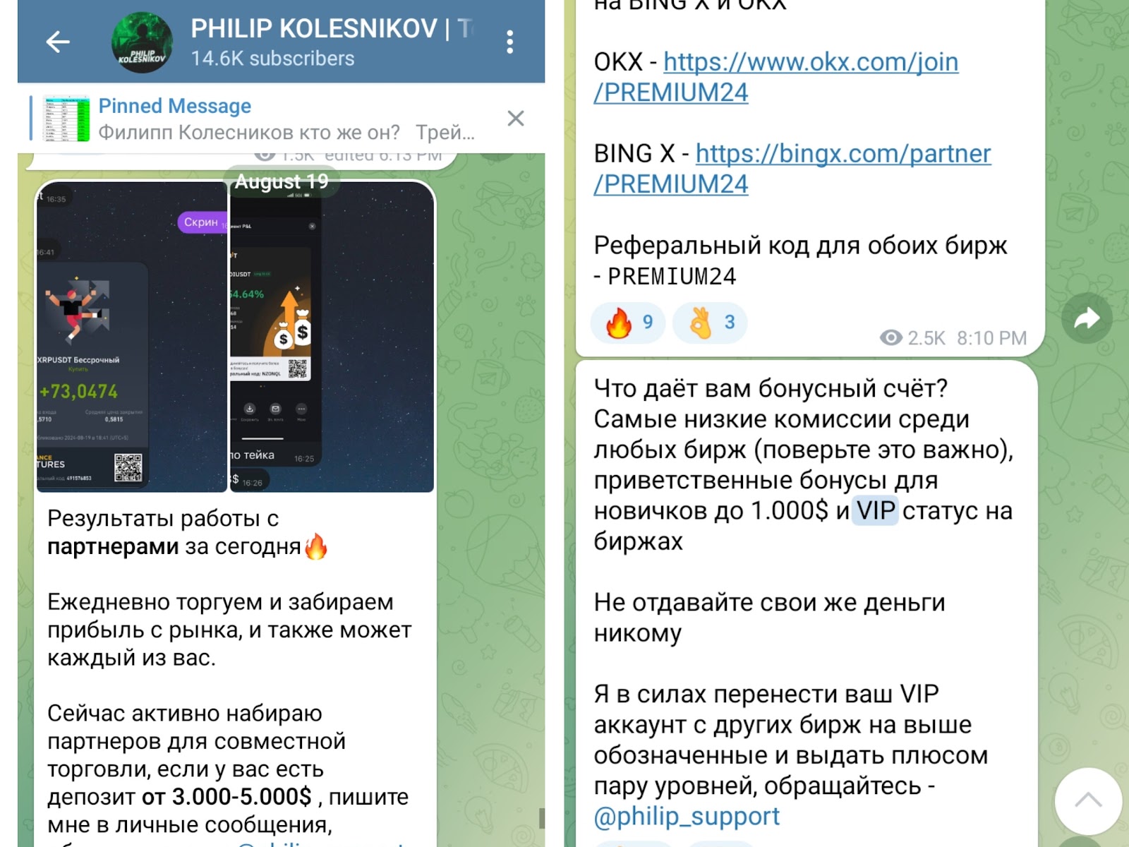 В сообществе автор делится мыслями по поводу крипторынка. Еще предоставляет результаты по сделкам с закрытой группы. Однако такие отчеты не подтверждены и могут быть поддельными.Во время анализа проекта мы заметили регулярное продвижение криптовалютных бирж. Трейдер предлагает регистрироваться на OKX и BingX по своему промокоду. Филипп утверждает, что его партнеры получат бонусы и минимальные комиссии. На самом деле с помощью рефералов трейдер будет получать процентную прибыль.