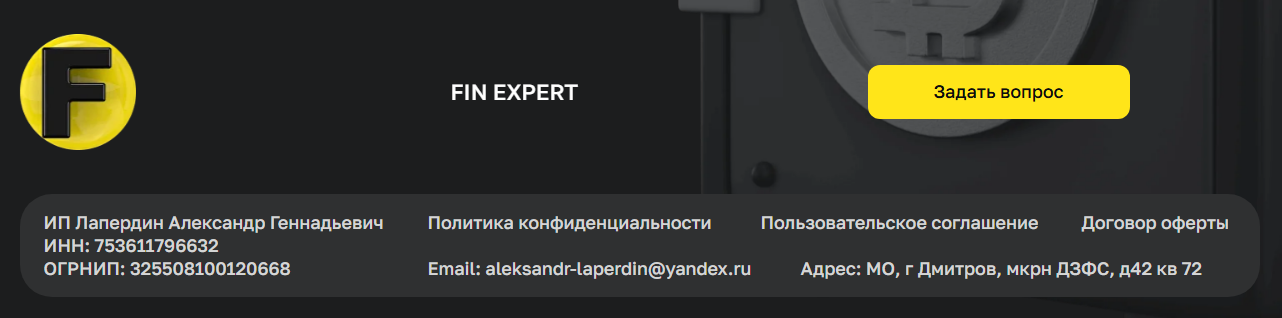 Fin Expert – это проект ИП Лапердина Александра Геннадьевича, который позиционируется как обучающая платформа для начинающих и опытных трейдеров. В команде работают трейдеры Алексей Ершов и Марат Газизов. Они утверждают, что работают на рынке с начала 2000-х годов. Они якобы обладают многолетним практическим опытом и управляют значительными инвестиционными портфелями. Еще в проекте заявлен эксперт Анастасия Ласкунова (@anast_las). Связь с модератором возможна по почте aleksandr laperdin yandex ru.