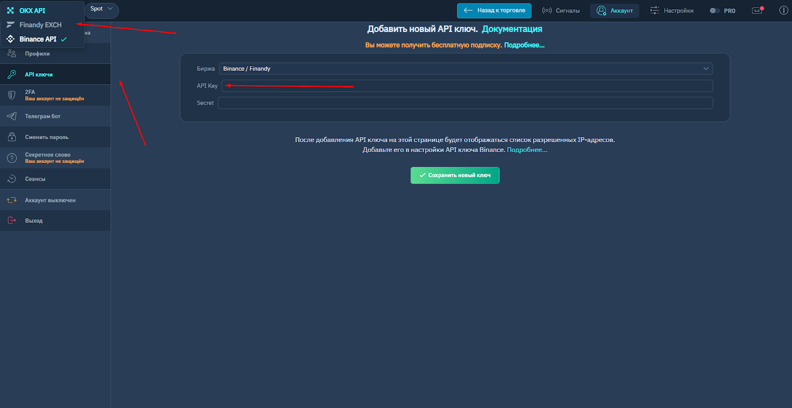 После этого вам откроется основной функционал торгового терминала. Перейдите в раздел “Аккаунт” => API ключи, где можете подключить биржу OKX или Binance.