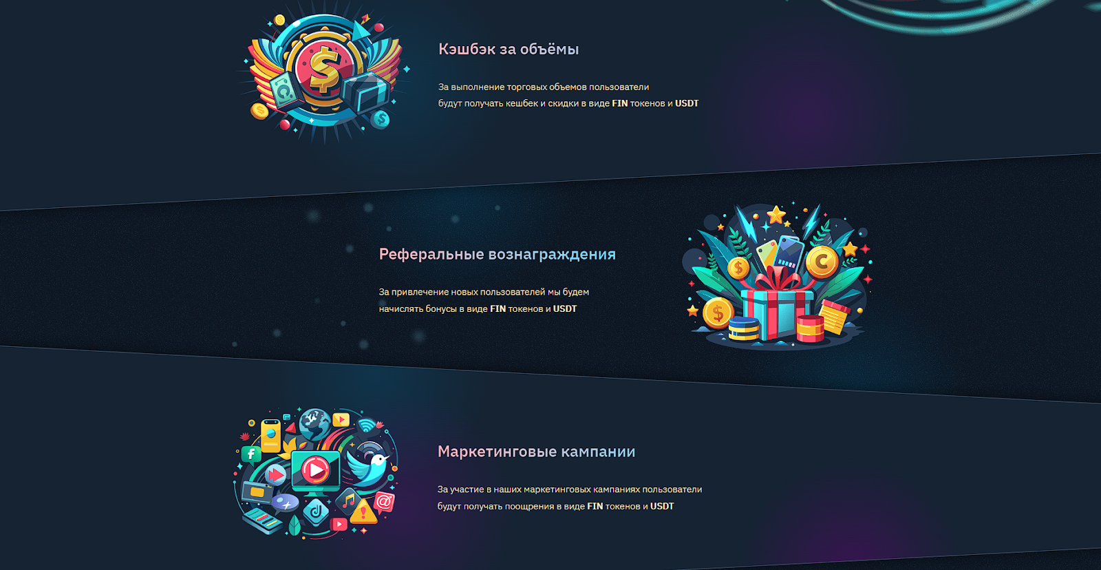 Внутри терминала для торговли Финанди есть реферальная программа, где за приведение нового пользователя вы получаете 10 FIN token. Последним этапом данного актива был pre-sale. Его польза заключается в уменьшении комиссий при торговле, а также он должен открыть доступ к уникальным функциям и акциями, о которых нет никакой информации.