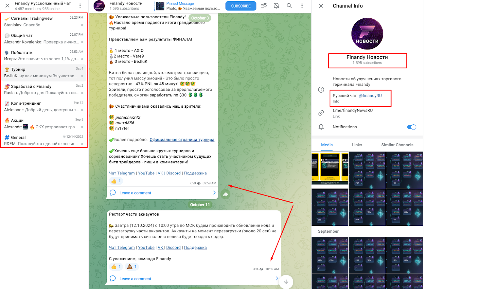 Там публикуется информация о технических работах терминала, рестартах, результатах конкурсов. Чат разделен на техническую поддержку и общий чат для пользователей, что положительно влияет на прозрачность проекта.