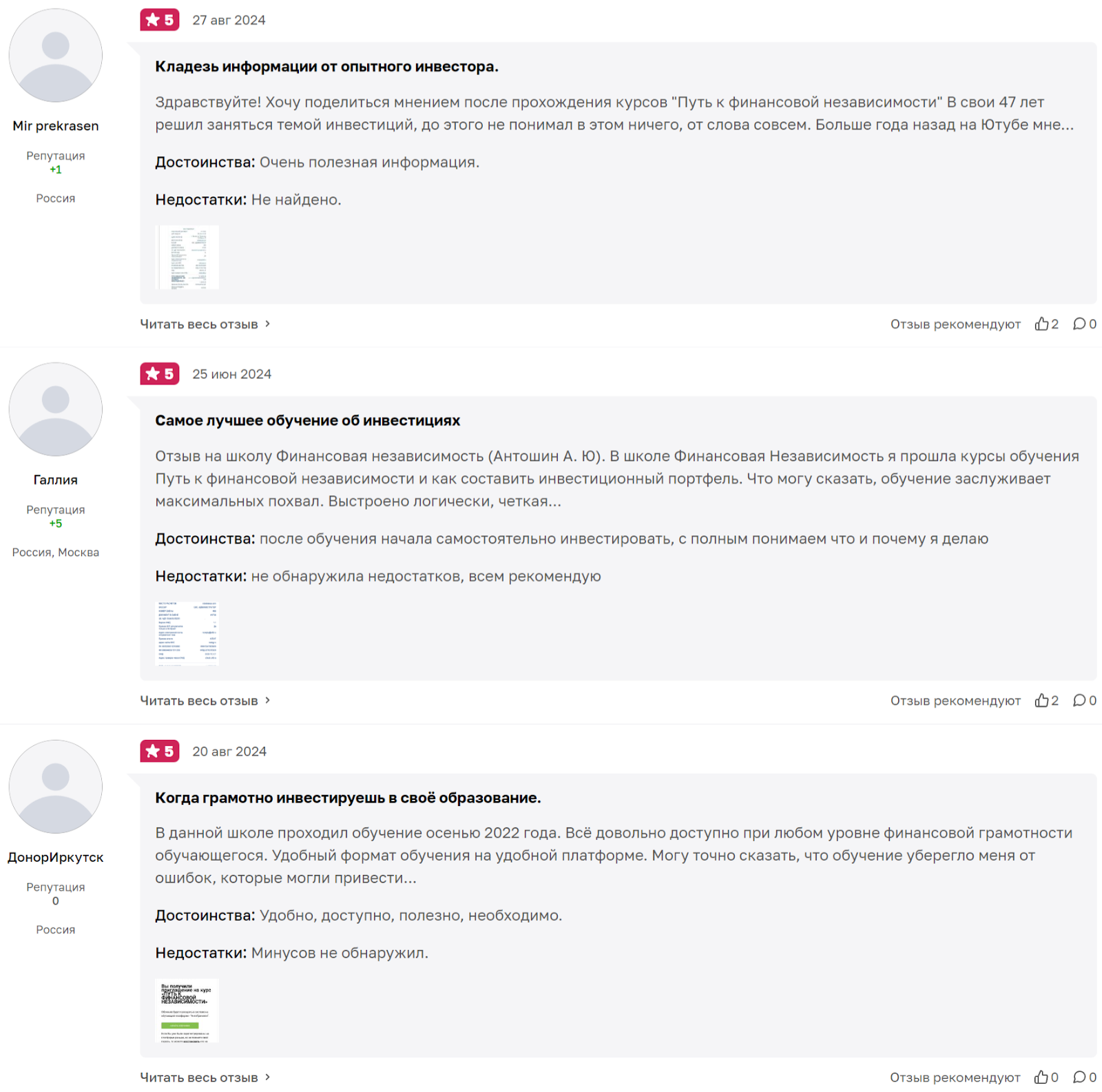 Изучение отзывов об Антошине А. Ю. показывает, что в целом ученики довольны качеством материала и отмечают плюсы курсов. Они утверждают, что автор грамотно выстроил логику обучения, дает полезную информацию и помогает реально начать инвестировать самостоятельно.