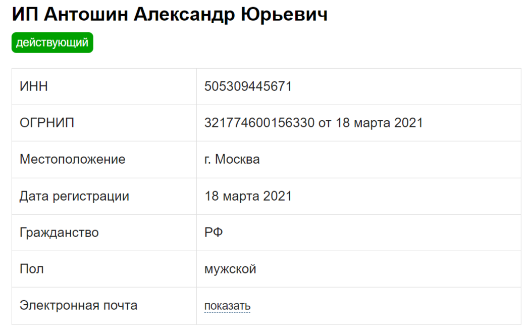 В футере приводится информация, что автор Финансовая независимость Антошин Александр Юрьевич имеет ИП и ведет официальную деятельность. На специальных сайтах удалось узнать, что предприниматель зарегистрирован еще 18 марта 2021 года. В качестве вида деятельности выбрано образование детей и взрослых (дополнительно), что характерно для многих инфоцыган.