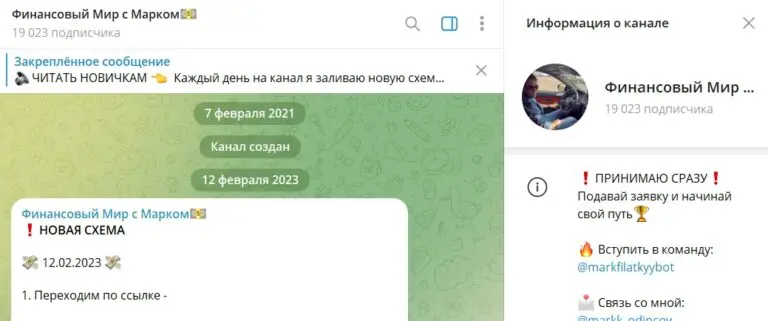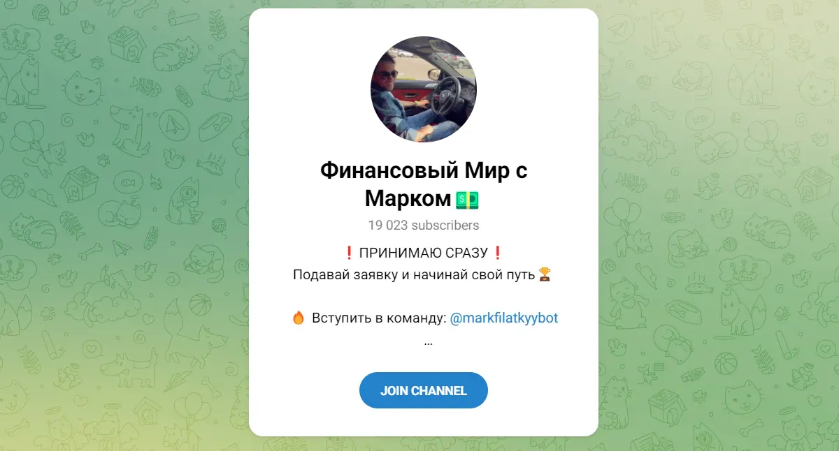 Финансовый мир с Марком Филатовым – это Телеграм-канал, на котором числится 36 000 подписчиков. При этом, новых участников Markk Odincov принимает только после личной проверки заявки. Одобрения придется ждать долго, возможно, несколько дней. Проект функционирует с 2021 года. Но до 2023 года новые почты не публиковалась. Помимо основного канала, Марк ведет еще паблики @timlazarkybot и @markfilatkyybot. Там работают боты, через которые принимаются деньги от клиентов.