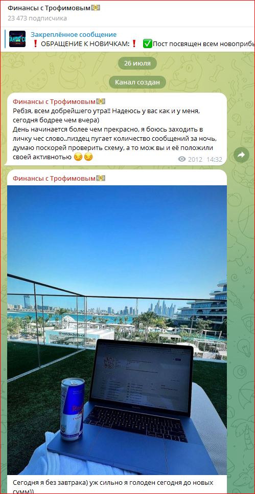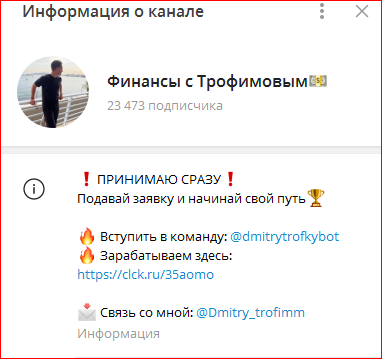 Телеграм-канал Дмитрия Трофимова, посвященный заработку в интернете, зарегистрирован 26 июля 2023 года. В @dmitrytrofkybot числится 23 400 подписчиков. Это боты. Реально контентом интересуются до 500 человек. Явно трейдер использовал накрутку. Большое количество контента в телеграмм-канале Дмитрия Трофимова – это мотивирующие сообщения.