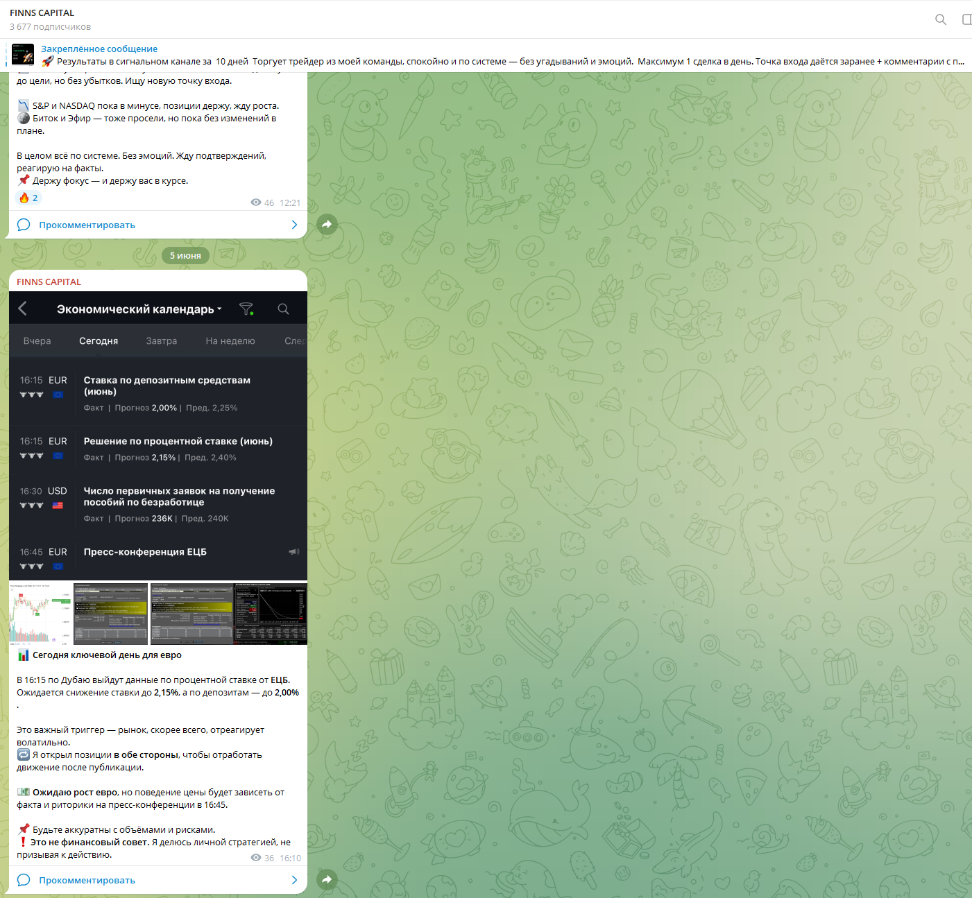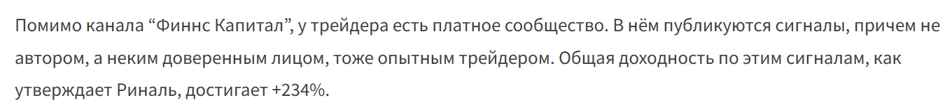 Автор Finns capital активно рекламирует платное сообщество в Telegram, стоимость месячной подписки составляет $10. Сервис предоставляет торговые сигналы для криптовалютного трейдинга, эксперт утверждает, что их общая доходность может достигать 234%.