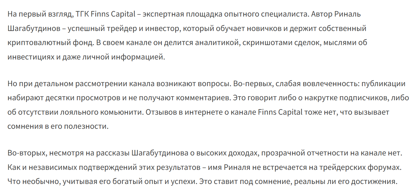 Finns capital – телеграмм-проект трейдера Риналя Шагабутдинова, предлагающего бесплатные финансовые рекомендации. В обзоре нам предстоит выяснить, стоит ли сотрудничать с автором, проанализировать его предложения и ресурсы в сети.