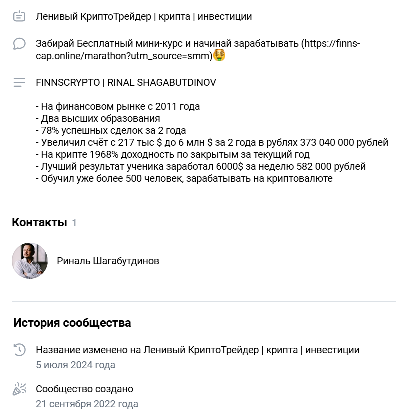В VK мы нашли сообщество автора «Ленивый КриптоТрейдер крипта инвестиции» с всего 10 подписчиками, посты не публикуются с сентября 2024 г. Есть также ютуб-канал с ником Finnscapital.