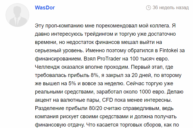 Отзывы о компании в сети преимущественно положительные. Клиенты отмечают, что успешно проходили челлендж и начинали торговать с привлечением финансирования. Терминал Fintokei работает безупречно, деньги удалось вывести быстро, без затруднений.