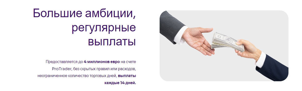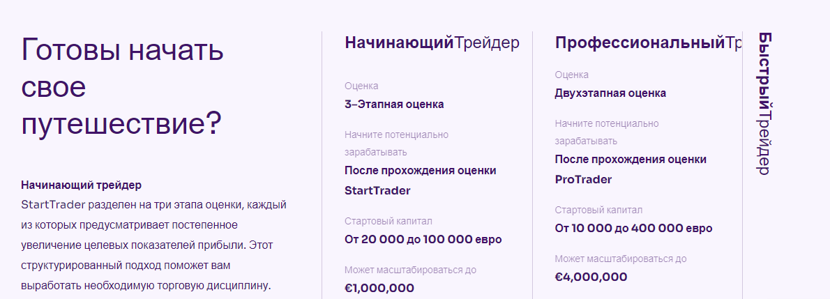 - ProTrader. Счет предполагает прохождение трейдером двухэтапной оценочной программы. Ее удачное завершение позволяет торговать на сумму 400 000 евро и увеличить счет до 4 млн. евро, получая до 95% прибыли.