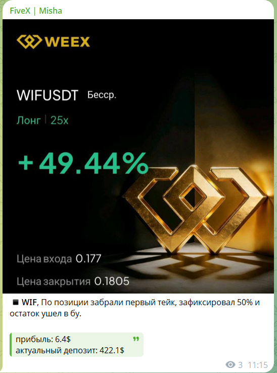 Misha FiveX в Telegram предлагает покупать доступ в его платный канал, где он с другими участниками устраивает совместные инвестиционные сессии и коллективно торгует криптовалютой на бирже. Какая стоимость вступления в его группу и по какой цене нужно покупать доступ к сигналам Михаила – заранее не сообщается. Берет ли трейдер какой-то процент со сделок неизвестно и в целом все условия сотрудничества нужно заранее узнавать отдельно. В открытом доступе расценки своих услуг автор не выставляет и «ФайвИкс Мише» нужно писать в мессенджере, чтобы узнать подробности того, как он предлагает заработать.