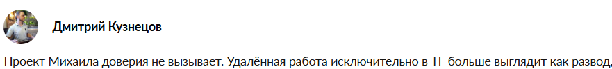 Подобных оценок канала немало. Проект Михаила в Телеграмм не вызывает доверия людей из-за того, что они считают, что он представляет из себя систему развода.