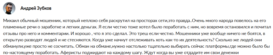 - Отзывы об авторе отрицательные, его обвиняют его в финансовом разводе, следовательно, подтверждается сомнительное впечатление о репутации Михаила.