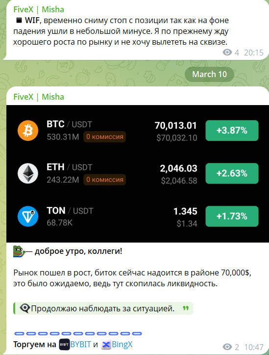 Также под постами автор иногда оставляет реферальные ссылки на биржи вроде ByBit и BingX. Возможно, что Михаил зарабатывает на своих рефералах.