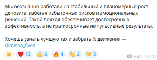Якобы опытный автор сообщает, что в своей закрытой группе он с клиентам работает на планомерный и стабильный рост своего депозита. Торговать Михаил предлагает в основном криптовалютами. Его подход к инвестициям якобы обеспечивает эффективные, а не краткосрочные результаты. Чтобы присоединиться к трейдеру и торговать в его группах вместе с другими подписчиками, нужно писать лично Михаилу.