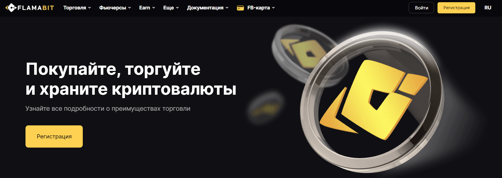 Сайт брокерской компании по торговле криптой локализован под русскоязычную аудиторию. В правом верхнем углу располагаются кнопки входа и регистрации. В левой части ресурса возможного скам-обменника FlamaBit можно найти вкладки для перехода в сервисы трейдинга криптой, фьючерсами.