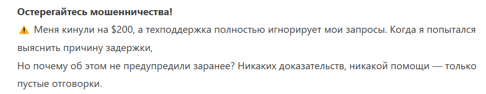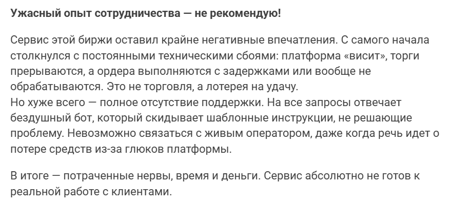 Пользователи пишут, что на бирже невозможно торговать, постоянные сбои и глюки в системе, отсутствие элементарной поддержки от операторов, так как все время отвечает бот. Они указывают на пустую трату времени и денег при сотрудничестве с сервисом.