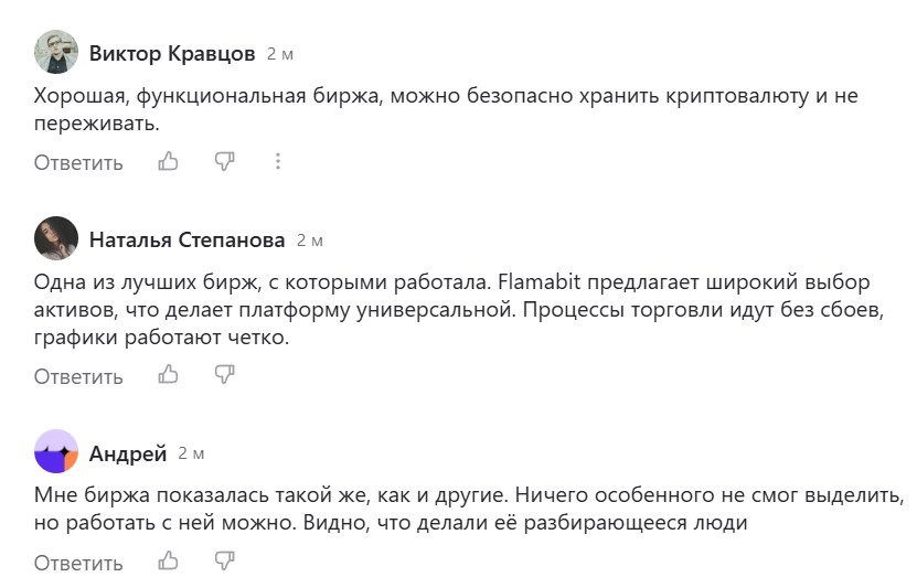 В положительной обратной связи пользователи указывают, что с биржей FlamaBit ничего плохого не случилось, на криптобирже нет мошенников и на «Флама Бит» приятно работать. У трейдеров остались только хорошие впечатления от сотрудничества.
