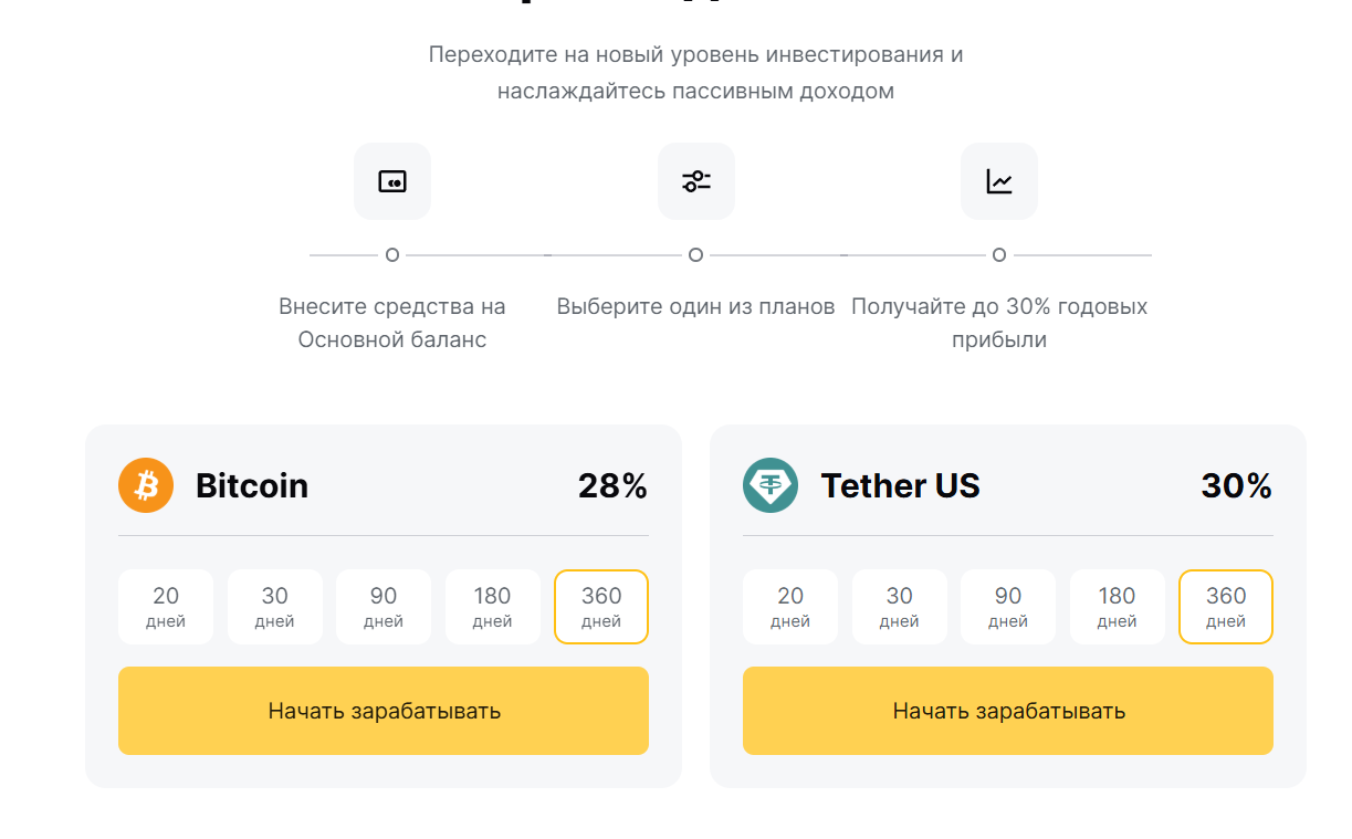 Инвесторам предлагается положить криптовалютный депозит в биткоинах или стейблкоинах. Пользователи будут получать пассивный доход в размере 30 % годовых, по словам разработчиков проекта.