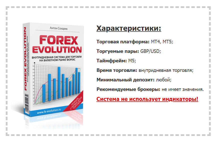 Форекс Evolution — система внутридневной торговли. Разработана трейдером под именем Антон Сохарев. Автор утверждает, имеет 12-летний опыт торговли на рынке и хочет поделиться своими умениями с массами. Ну, точнее — продать свои знания. То есть речь про инфоцыганщину.