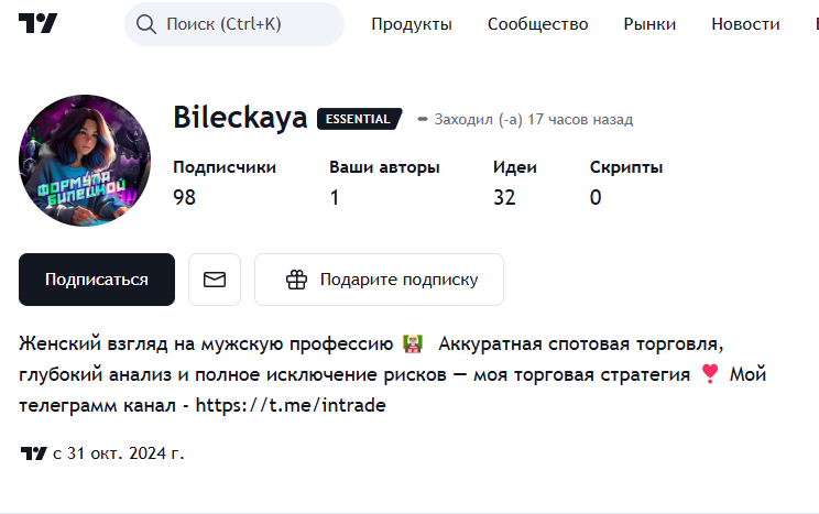 Авторша Формулы Билецкой подкрепляет каждый пост ссылкой на TradingView, где у нее с 31 октября работает аккаунт. На него подписано 98 человек. Всего опубликовано 32 идеи. Кстати, подписчики сильно похожи на ботов (странные ники, нет аватарок и идей).