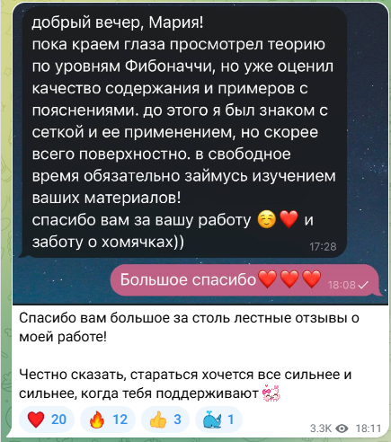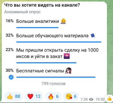 После этого голосования трейдерша написала, что «ее канал — не очередная сигнальная помойка, созданная для прогрева под закрытую группу. Да, она будет давать сигналы, разборы и прогнозы. Но главное — она дает свой опыт и много бесплатного обучающего материала, чтобы люди могли сами стать теми, кто сможет зарабатывать десятки и сотни тысяч долларов на рынке».