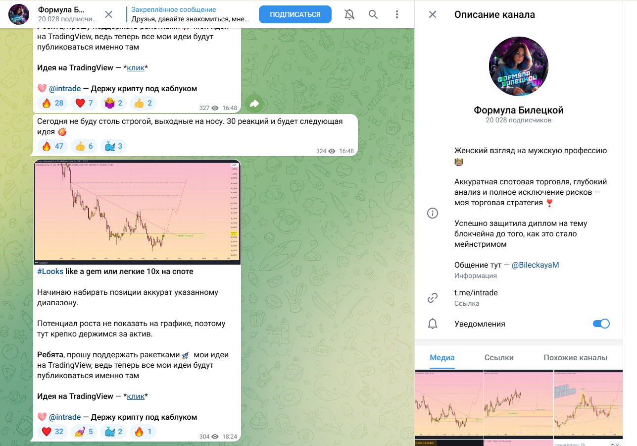 Формула Билецкой — канал в Телеграме, работающий по ссылке @Intrade. Его админ, некая Мария Билецкая, трейдер, ведет проект, «с женским взглядом на мужскую профессию». Она пишет про «аккуратную» спотовую торговлю, глубокий анализ и полное исключение рисков — это ее торговая стратегия.