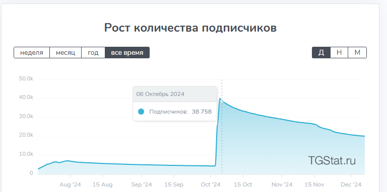 Но напрягает тот факт, что в октябре 2024 года админы канала купили в него более 35 тысяч подписчиков. Ни одна рекламная кампания не принесла бы такого результата.