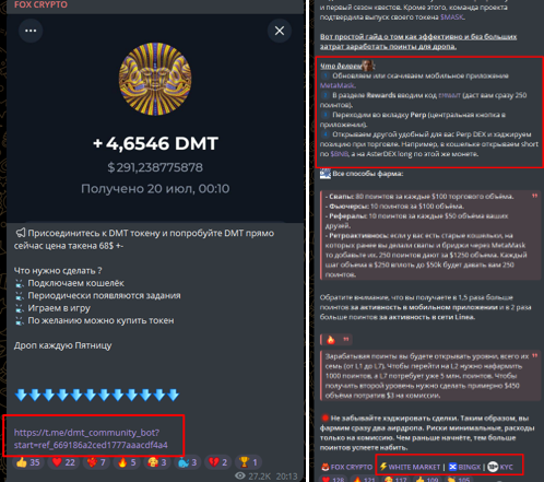 Канал заявлен в качестве личного блога. Но на самом деле практически каждый пост содержит рекламные и реферальные ссылки. Новости и аналитика оформлены в виде практических рекомендаций, личного опыта трейдера. Но при детальном рассмотрении становится видно, что это просто маркетинговый ход.Темы – разнообразные, от криптокошельков до фарм-проектов. Подписчикам обещают высокие бонусы и возможность быстрого заработка. Надо только пройти регистрацию и выполнить все условия. Чаще – это пополнение баланса, после чего пользователю будут начислены реальные средства. Некоторые проекты являются крупными биржами, но часть – малоизвестные и непопулярные площадки, пополнение депозитов на которых может привести к потере средств.