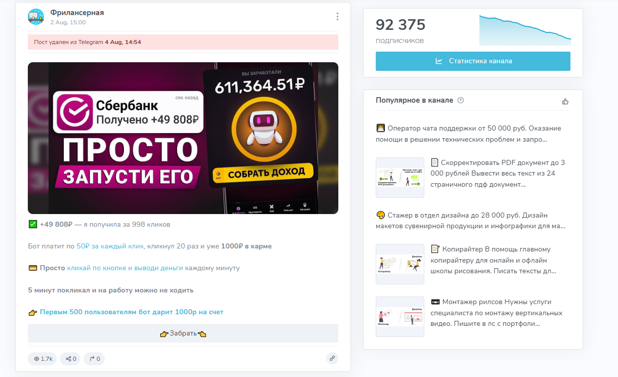 Тгк Фрилансерная был создан в 2019 году и за все время собрал более 90 000 подписчиков. Общее число пользователей постоянно падает и ежемесячно отписывается до 3 тысяч людей, а средний охват постов не превышает и 5%. Все эти факторы говорят о накрутке ботов. При этом в специальном канале Televacancyrules, где находятся условия сотрудничества, они утверждают, что имеют качественный источник трафика, в чем можно усомниться.