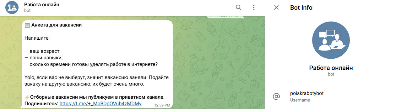 Для поиска работы необходимо заполнить минимальный пакет информации: возраст, навыки и возможности по временным затратам. При этом неизвестно, сколько придется ждать ответа. Также бот используется в качестве переходника на другие проекты Елизаветы, среди которых Удаленочка, Дистанционка и Стажировки, однако там ситуация схожа и конкретные вакансии публикуются редко.Также Елизавета в правилах написала, что не будет продвигать вакансии, где необходимо выполнять какие-то простые задания для заработка, но в ленте можно заметить не один пост от различных компаний, где собираются платить за оценки, лайки, отзывы. Вдобавок заработок по этим вакансиям явно завышен, ведь маловероятно, что за подобные действия вы сможете заработать до 10 000 рублей.